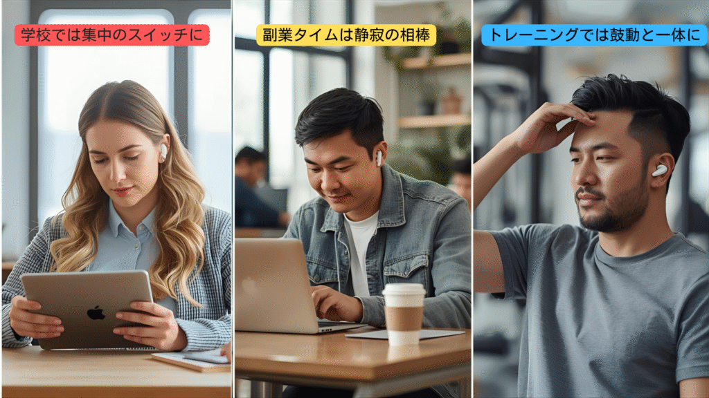| 通勤・校内移動 | Pro 3 | ノイズキャンセリング&外音取り込みのバランス◎ |